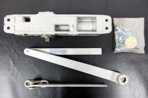 Clean, ready to use, open original box, hardware bag still sealed. LCN door closer model 1072 by Ingersoll Rand. Regular arm, high quality aluminum, light scratches on arm. Weighs 7.5 pounds total, box measures 12.5 X 3 X 5 inches.