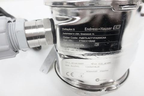 Excellent working condition, very clean, ready to connect. Endress + Hauser pressure transmitter model Deltapilot S, FMB70-ACT1FA200CAA. Long protected wire, ready to connect to your system. Specifications: NEMA4X/6P, IP66/IP68, MWP 530kPa, Span 4/40 kPa, P -40…40kPa, 4…20 mA HART, 11.5…45 VDC. Weighs 2.16 kg and measures 8 3/8 X 6 3/8 X 4 1/2 inches. From a closing plant in Oshawa, Ontario, Canada.