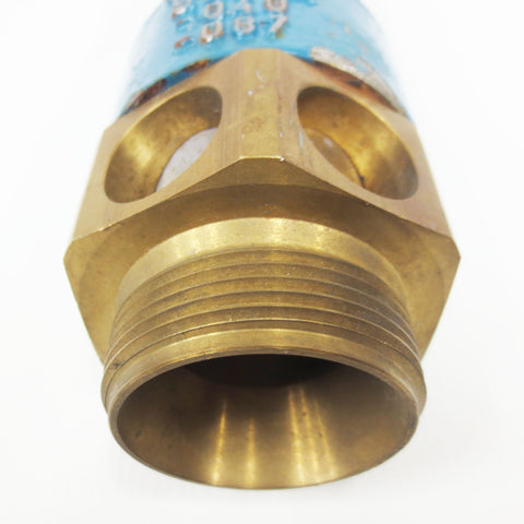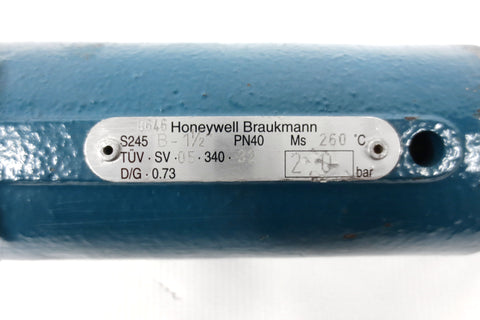 Excellent working condition, very clean. High performance safety valve by Honeywell Braukmann, model S245 R. Male threaded end with a 1 1/2" inside and 1 7/8" outside diameter. No rust, original paint is missing in a few spots. Specifications: 2.0 Bar, Ms 260°C, PN40, D/G 073. Weighs 3 kg, 12 inches long, 2 5/8 inches total diameter.