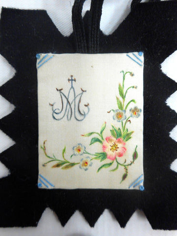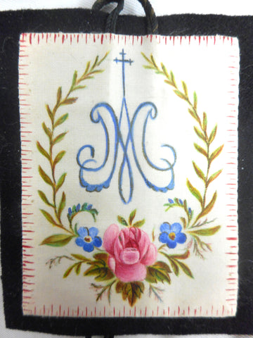 All 4 necklaces are in mint condition, no stains, no color loss. Each one is hand painted and embroidered on silk and supported by black felt. Beautiful drawings of flowers, leaves and Gothic religious emblems. These were found in rural Quebec and were worn by pilgrims during marches and ceremonies. One pair measures 2 3/4 X 2 1/4 inches and the other 2 3/4 X 3 inches.