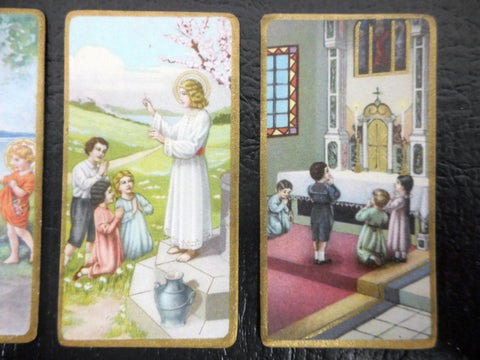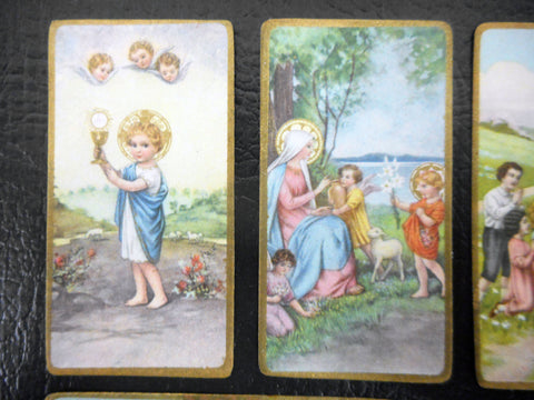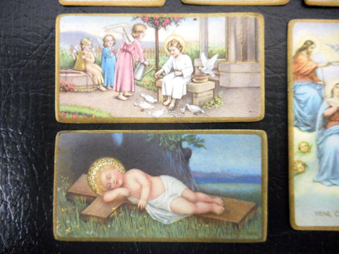 All 8 miniature holly cards are in mint condition and from the same series. Each one is numbered, printed in Switzerland and Italy and measures 2 3/8 X 1 1/4 inches. Scenes from the life of Jesus, beautiful colors and gold paint details.