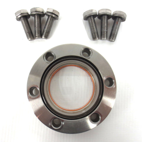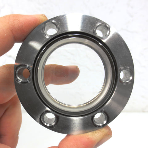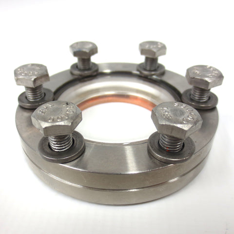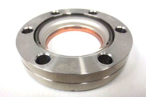 Excellent condition, very clean, ready to install. Complete with a copper gasket and 6 mounting bolts. Viewport high vacuum chamber conflat flange, 2.75 inches diameter, made by MDC Hayward. Glass window in mint condition, thick 1/2 inch high quality stainless steel. Surplus from a cryogenic laboratory. Total weight 268 grams.