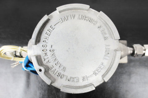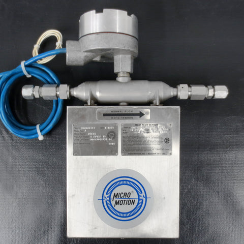 Functional, very clean, ready to install. Mass flow sensor model D by Micro Motion, P/N 40S-SS-CAJON/NPT 8919. Specifications: 3/4" outside and 3/8" inside diameter tubes, 1250 PSIG tube and conn., -250 to 204°C temperature, sensor D0040S119, meter type 3, serial 11893. Tube fittings, clean electrical wires and elbow fittings included. Total weight 7 pounds, sensor only measures 7 1/2 X 11 1/2 X 2 1/8 inches.