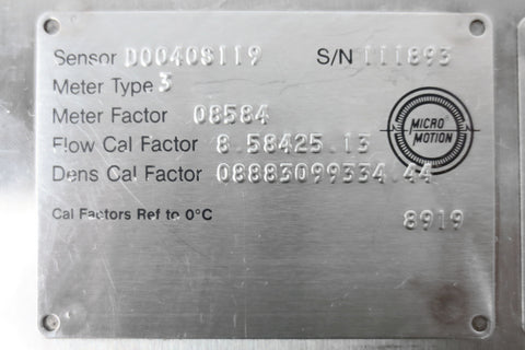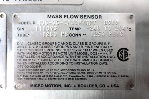 Micro Motion Mass Flow Sensor Model D 40S-SS-CAJON/NPT 8919, 1250 PSIG