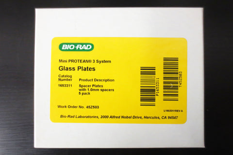 New pack of 5 Bio-Rad glass spacer plates with 1.0mm spacers, model 1653311 for Bio-Rad Mini-Protean 3 electrophoresis gel casting system. Surplus from Canada's National Research Council.