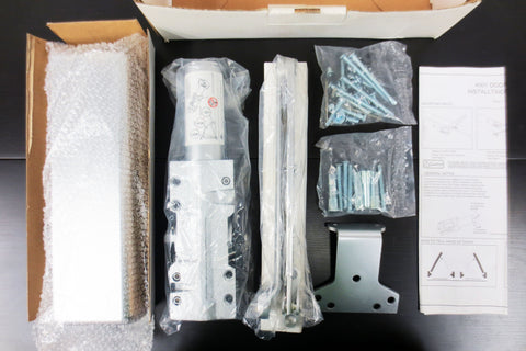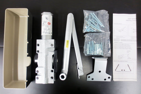 New, open box, complete with instructions. Commercial multi-size 1-6 door closer model 4001AL by Dorex. High quality construction, power adjustable, back check, barrier free, aluminum finish. Weighs 11.5 pounds total, box measures 13 X 4 X 4 inches.