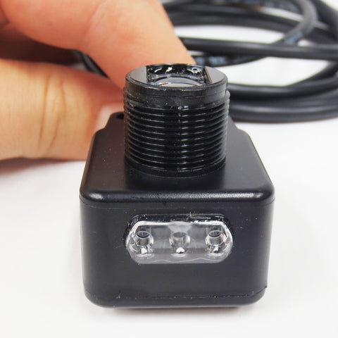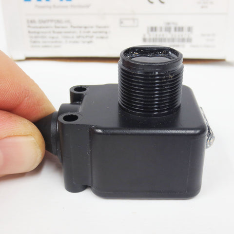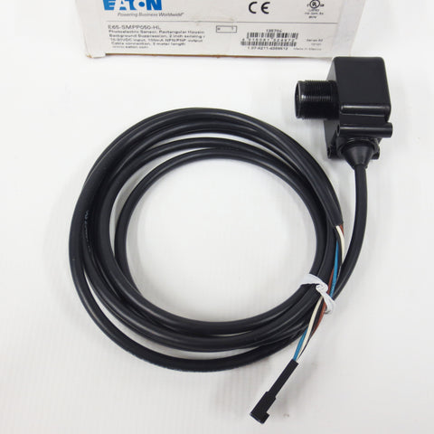 New in its original open box, instructions included, inspected and functional. Photo sensor by Eaton Cutler-Hammer, SM Series E65-SMPP050-HL. Specifications: Target lock, background suppression, 10-30VDC input, 100mA, NPN/PNP output cable connection and a 2 meter long wire.