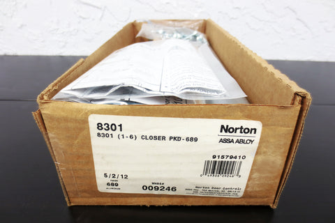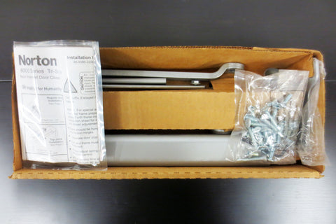New, open box, complete with instructions and template. Commercial hydraulic door closer by Norton Assa Abloy, non hold open model 8301, size 1-6. Tri-style, aluminum finish #689. Weighs 6.5 pounds total, box measures 15 X 3.75 X 9 inches.