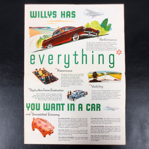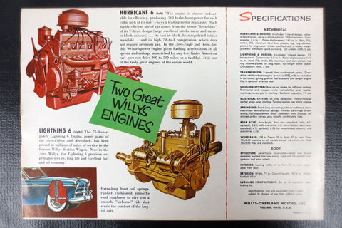 Mint condition, complete, no tears. Original 1953 Aero Willys-Overland car dealer's booklet/poster. Unfolds in 6 parts from 11 1/2 X 8 to 23 X 24 inches. Great colors and graphics, no color loss. Shows the Aero-Willys Ace, Falcon, Lark and Eagle as well as the Hurricane and Lightning 6 motors. Detailed descriptions and specifications, all in English. Brochure will be shipped in a waterproof and rigid package.
