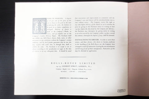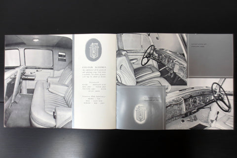 Original, excellent condition, complete. 1976 Rolls-Royce Silver Dawn car 8 pages brochure, 9 3/4 X 8". Glossy pages in silver, black and white. Presentation of the Rolls-Royce Silver Dawn, its specifications, color schemes, paint works, furniture hide upholstery, steering, gear and dash. Reprinted in 1976 by the Rolls Royce Owner's Club by printer Herbert Fitch. Brochure will be shipped in a waterproof and rigid package.