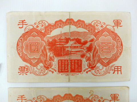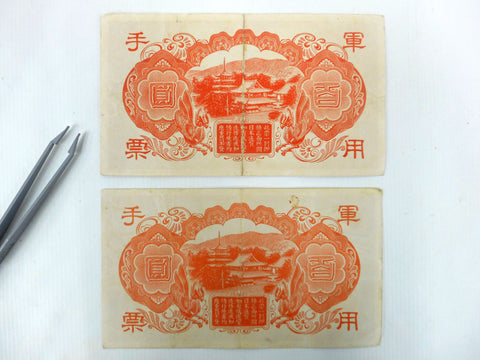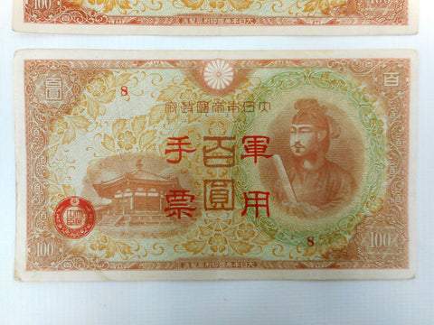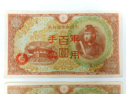 Pair of 1944 Japanese 100 Yen banknotes, found in a private collection with grading detail Extremely Fine EF/XF. Each one measures 6 1/4 X 3 1/2 inches.
