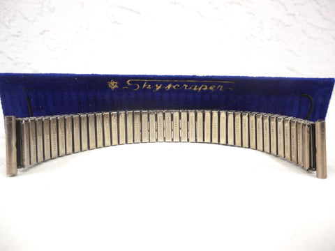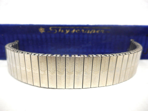 Perfect condition, from the 1960's, never used (New old stock). For 17 mm watches. Still on its original Skyscraper display felt. Extensible watch band with cool chevron patterns. Silver metal and stainless steel back. 6 1/8 inches long. Will complete and refresh the look of your vintage watch.