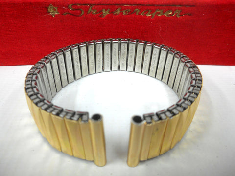 Perfect condition, from the 1960's, never used (New old stock). For 17 mm watches. Still on its original Skyscraper display felt. Extensible watch band with a cushion pattern in the middle. Golden metal and stainless steel back. 6 1/8 inches long. Will complete and refresh the look of your vintage watch.