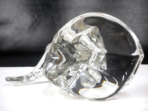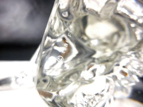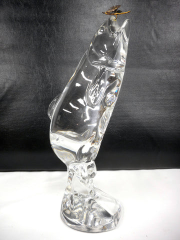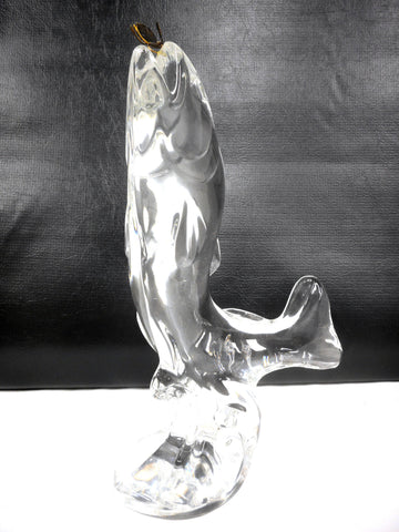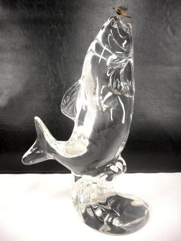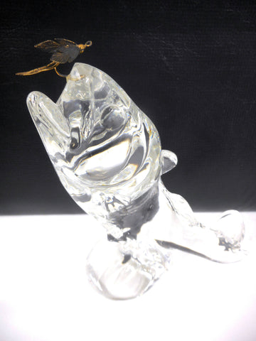 10 1/2" tall, mint condition, very clean, no chips. Signed FM 1988, for Konstglas Ronneby, Sweden. Original gold metal fish hook. Great craftsmanship, fish is jumping out of the water attached to his hook.