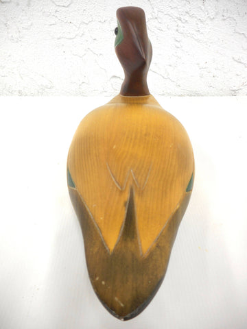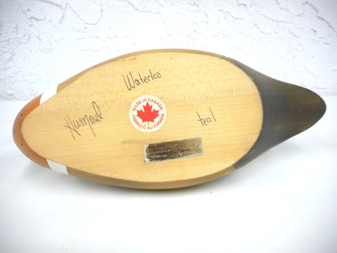 Hand carved wooden duck made in Quebec, Canada. Has its original maker's tag: Rudy Erfle. Identified under base has a "Hummel Waterloo Teal" duck. Duck measures 12 inches long, 5 3/4 in tall, 4 1/4 in wide. Beautiful craftsmanship, details and proportions. Solid pine, smooth finish.