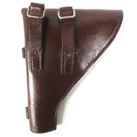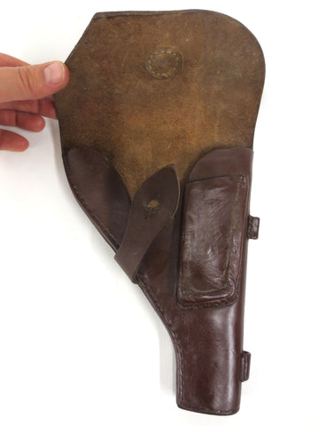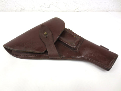 Excellent condition, authentic WWII German military police pistol holster. Faint red stamps inside. Thick high quality leather, hydrated and sturdy. Has a flap over strap and a brass button that hold revolvers well. Munitions compartment and 2 sturdy straps with metal hooks on back. Side has leather hooks for a gun cleaning tool. Bottom of holster is flat (for large muzzle). Measures 8 1/2 X 6 1/2 inches. We currently have 4 similar ones acquired from the same collection in Montreal, Quebec, Canada.
