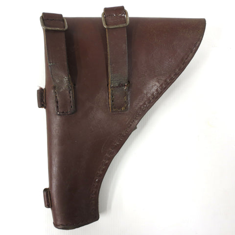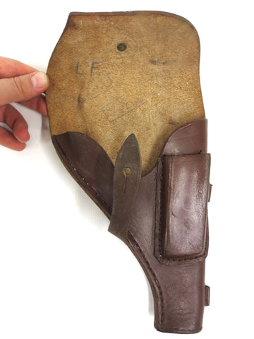 Excellent condition, authentic WWII German military police pistol holster. Initials "LF" and faint stamps inside. Thick high quality leather, hydrated and sturdy. Has a flap over strap and a brass button that hold revolvers well. Munitions compartment and 2 sturdy straps with metal hooks on back. Side has leather hooks for a gun cleaning tool. Bottom of holster is flat (for large muzzle). Measures 8 3/4 X 6 1/2 inches. We currently have 4 similar ones acquired from the same collection in Montreal, Quebec, Canada.