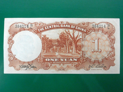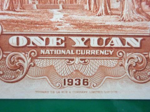 Perfect Uncirculated UNC condition, printed off center. 1936 Chinese 1 Yuan banknote number 384014 from a private collection. Measures 5 6/8 X 2 7/8 inches.