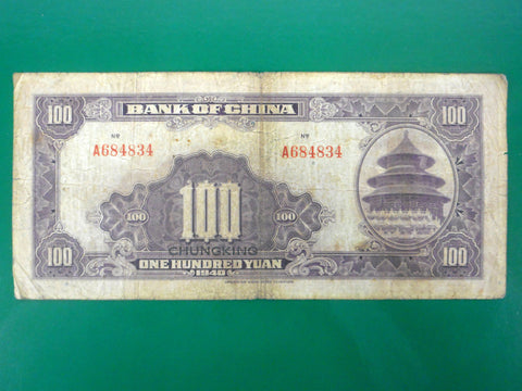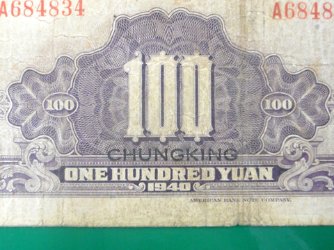 1940 Chinese 100 Yuan banknote number A684834 from a private collection. Found with grading information VF Very Fine. Measures 5 2/8 X 3 2/8 inches.