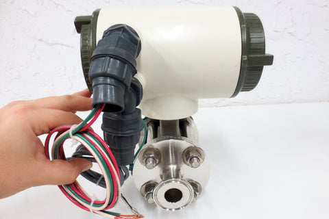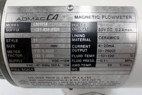 Functional, very clean, ready to install. Yokogawa magnetic flow meter model Admag CA202SN with 2" outside and 7/8" inside diameter flanges signed MFF Italy. Specifications: Style S1, size 25 mm 1.0, supply 100-120Vdc, 100-240Vac, Pulse output 30V DC 0.2 Amax, lining material is ceramics. Clean electrical wires and elbow fittings included. Total weight 17 pounds, measures 10 X 11 X 9 1/4 inches.